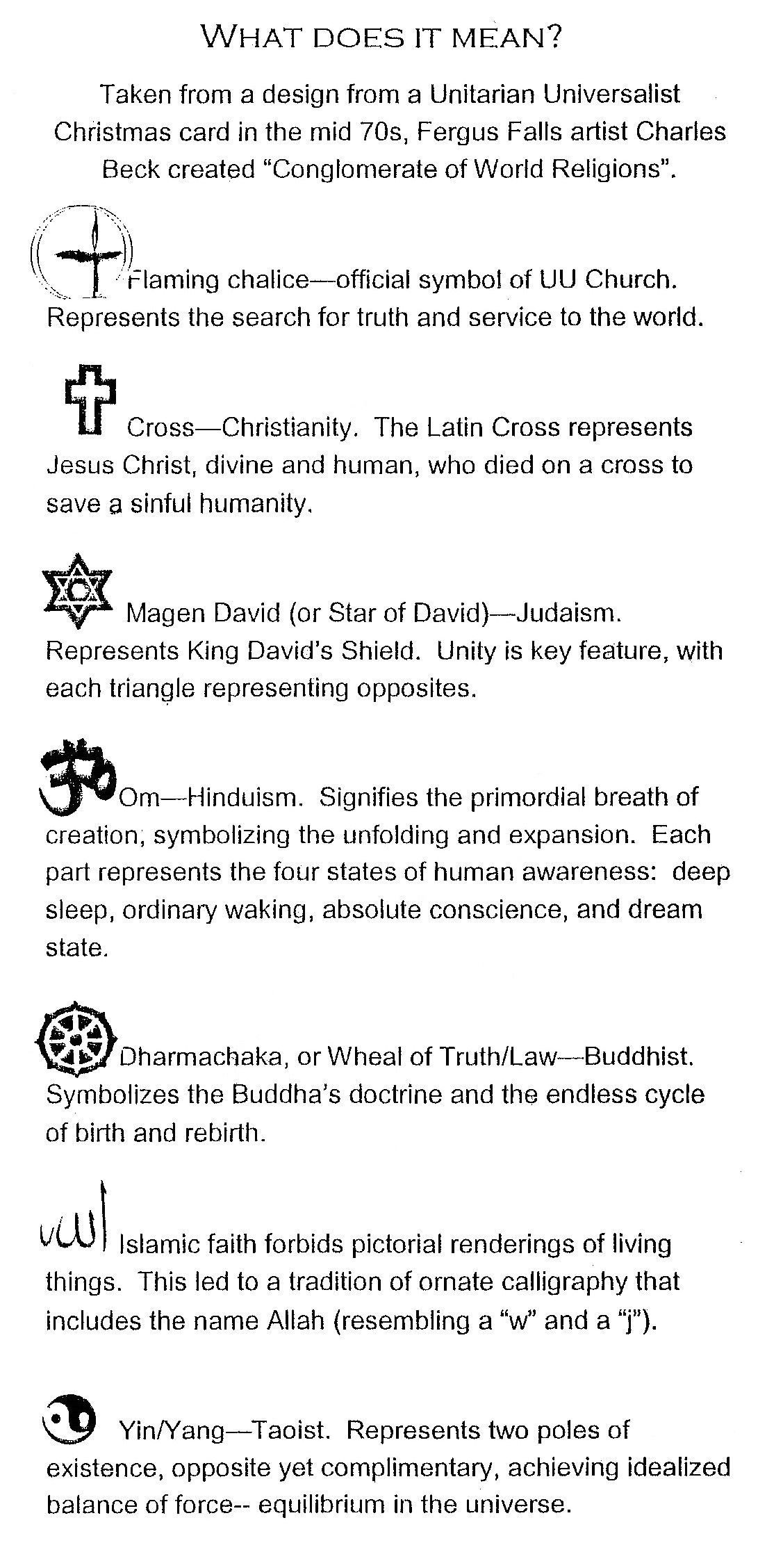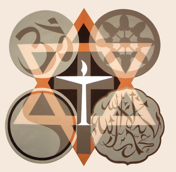 hangs on the wall at the front of our sanctuary. It contains symbols from several world religions.